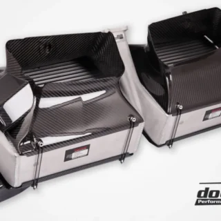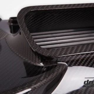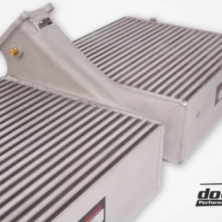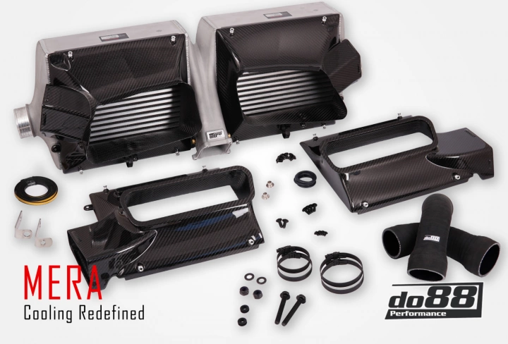If you ask us, this is the best you can get from an intercooler kit for this platform. No stone was left unturned in our pursuit of maximum performance in every area of ββthe system. The starting point is the renowned Garrett Motorsport cores, which are incredibly well-crafted with thin, stacked fins, precisely matching our specifications for cooling and airflow. The end tanks are made of thin die-cast aluminum to keep weight down while still utilizing airflow. To accommodate the thicker core, we replaced the air guides with the highest-quality carbon ducts! And to eliminate bottlenecks throughout the system, the intercooler connections were enlarged and fitted with DO88 silicone hoses designed with smooth, sweeping bends. We made no sacrifices or compromises during this developmentβbehold the results!