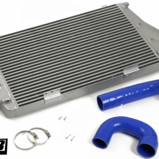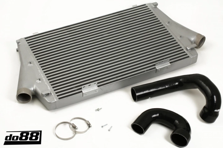 The do88 high-performance intercooler has 2.5″ (63 mm) hose connections instead of the 2.25″ (57 mm) of the OEM intercooler. Two silicone hoses are included to replace the OEM inlet and outlet intercooler hoses.