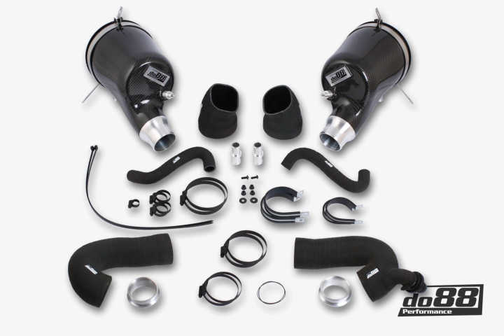 The do88 air filter kit is made from the highest quality vacuum-infused prepreg carbon fiber. It comes with CNC-machined connections to the turbo inlet pipes. To increase airflow, the kit truly utilizes all the space available within the car’s structure. The carbon housings are engineered to accommodate a large inverted cone filter from the renowned BMC, with their finest filter media on hand. The intake kit is held in place by a waterjet-cut stainless steel bracket. The DO88 air filter kit replaces the entire OE air filter box and is a true performance upgrade!