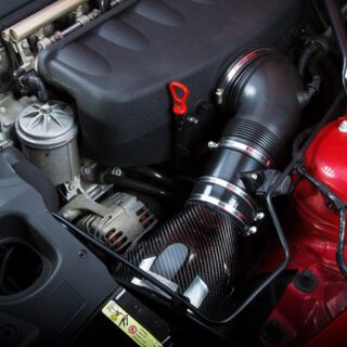 Made from 100% premium prepreg carbon fiber. This encapsulates the filter and is mated to an anodized aluminum inlet cap to ensure a smooth inlet flow path. The filter itself is a deep-pleated, high-flow dual-cone configuration that is dry to prevent damage to the MAF sensor. Finally, the assembly is mated to an aluminum heat shield that effectively protects the intake from engine bay heat and captures ambient air diverted from the air intake.
