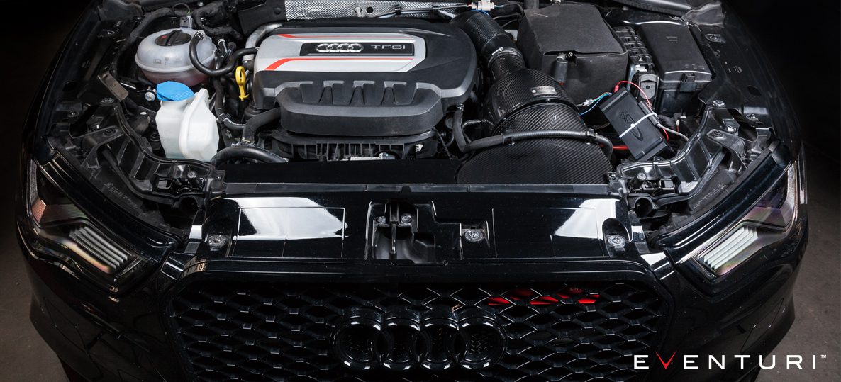 The Eventuri 2.0 TB MQB system uses a patent-pending carbon fiber housing that provides an aerodynamically efficient airflow path from the filter to the MAF tube. Not just another cone filter with a heat shield, but a unique design that invokes the Venturi effect, this remarkable air intake has demonstrated a whopping 25 horsepower extra over the standard 2.0 TSI engine.