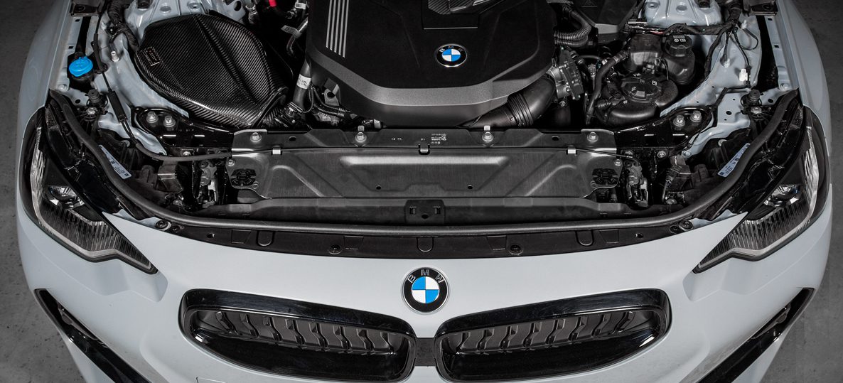 The G42 B58 Eventuri intake was developed to provide the turbo with a less restrictive flow path while maintaining low inlet temperatures. Heat and volume are the primary considerations when designing an intake for turbocharged engines. In the M240i, the intake system is located adjacent to the exhaust manifold, which quickly absorbs heat from the engine bay.