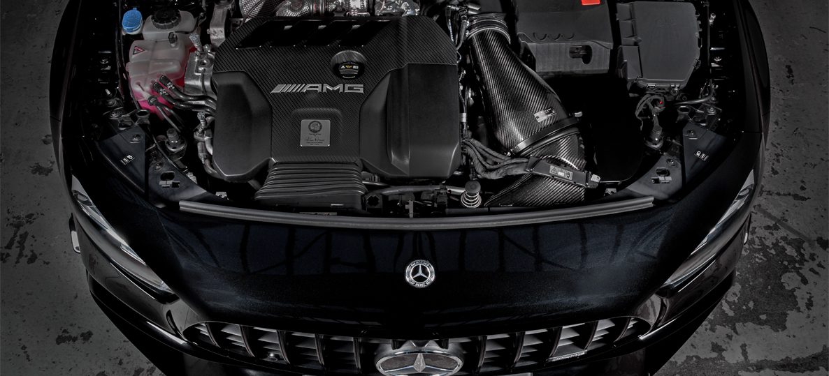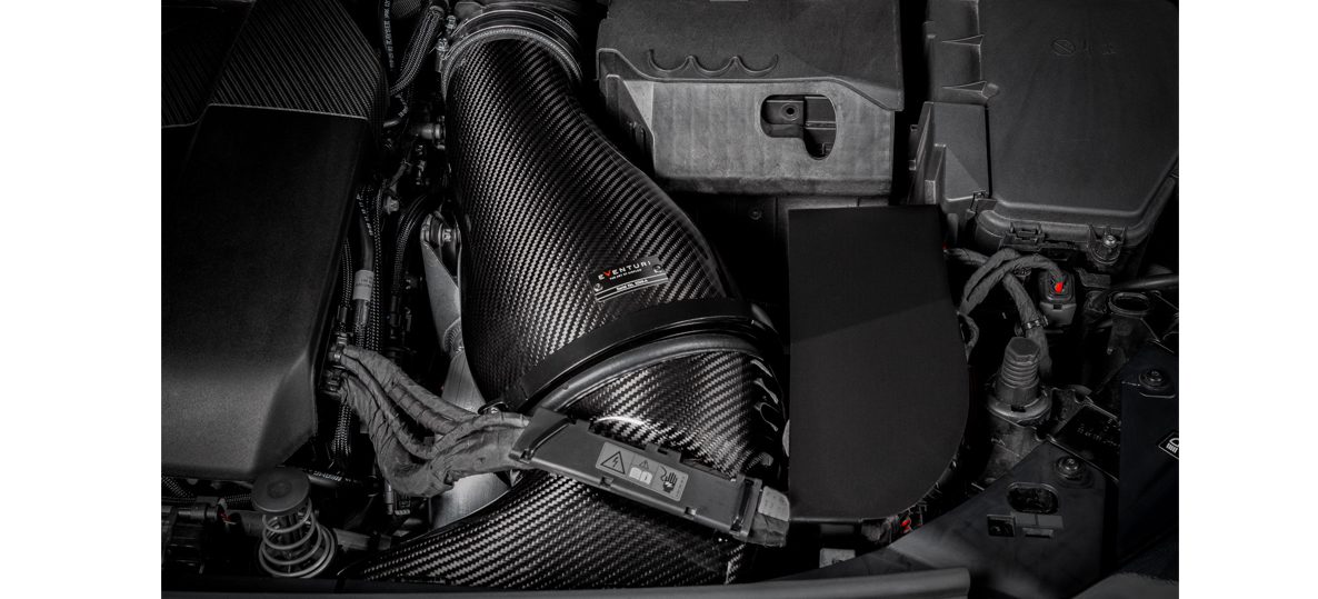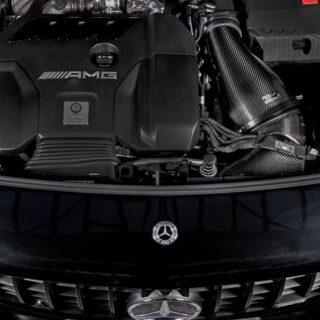 The Eventuri carbon fiber intake kit for the M139 engine of the Mercedes Benz A45 AMG W177 and CLA 45 AMG C118 consists of a large volume air box with washable and reusable synthetic air filter, carbon fiber air duct and everything needed for direct fitment without any modifications. The efficiency of this set is as high as its finish because, thanks to its unique design, this Eventuri intake not only increases incoming airflow, but also keeps intake temperatures low enough to allow a gain of 16 hp over a standard engine!