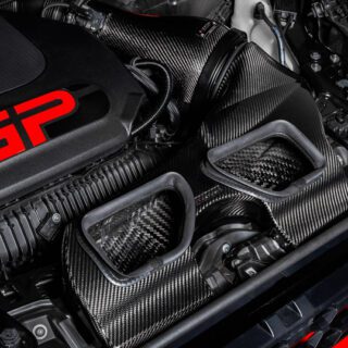 The Eventuri carbon fiber intake kit for the Mini Cooper S JCW GP3 has been developed to offer the best airflow to the turbocharger while maintaining low inlet temperatures. Not just another cone filter with a heat shield, but a unique design that invokes the Venturi effect, this Eventuri intake with a large-volume airbox, hood scoop, high-flow air filter, and air diffuser has shown a whopping 12hp more than the standard engine!
