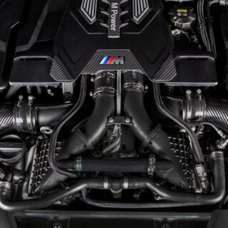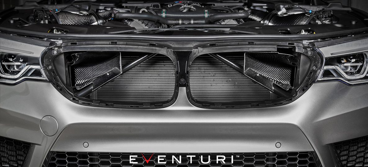 of the BMW M5 F90 was developed to provide less restrictive airflow to the supercharger while maintaining low inlet temperatures. The 4.4-liter V8 engine compartment heats up very quickly, so simply having an open-cone system would result in better airflow but higher inlet temperatures. Eventuri has therefore completely redesigned the intake system from the throttle body to the front grille with a high-efficiency sealed carbon fiber system!
