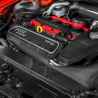 The Audi 8V RS3 Eventuri intake sets a new benchmark in intake design. It was developed to constrain the turbo inlet path and keep inlet temperatures low. The first objective was achieved by using 88 mm internal diameter pipes up to the turbo and using the unique Venturi housing to maintain laminar flow. The second objective was achieved by designing a sealed system for the standard cold air supply, thus ensuring that the turbo does not draw hot air from the engine bay. The intake duct draws air from the stock intake and has been maximized in volume to allow maximum flow through the filter.
