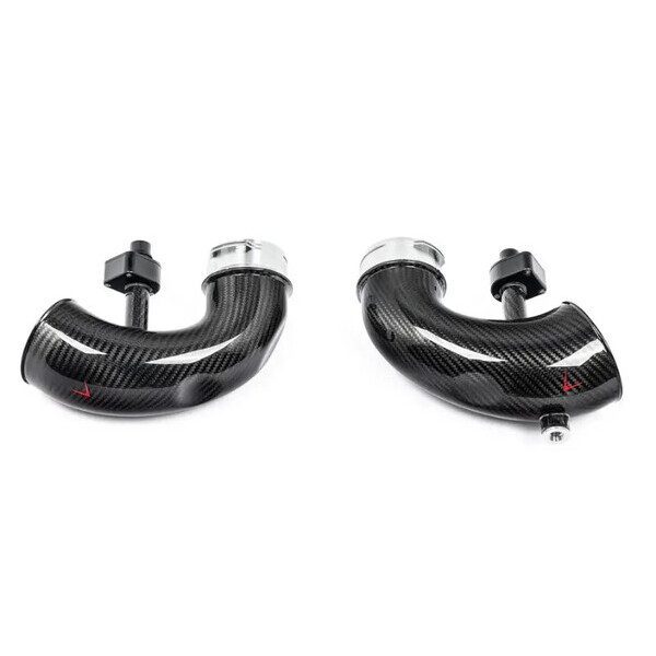 The perfect addition to our X5M and XM intake system to optimize the flow path to the turbochargers. Our carbon intakes have a larger volume than stock intakes, while maintaining a larger diameter all the way to the turbochargers. Stock intakes taper immediately after connecting to the intake, creating restriction, especially at higher boost levels. We’ve mitigated this restriction and designed the curvature to be as uniform as possible, allowing the turbochargers to operate with reduced drag. Made from pre-preg carbon fiber with CNC-machined flanges, the intakes also offer a visual enhancement to the engine bay.